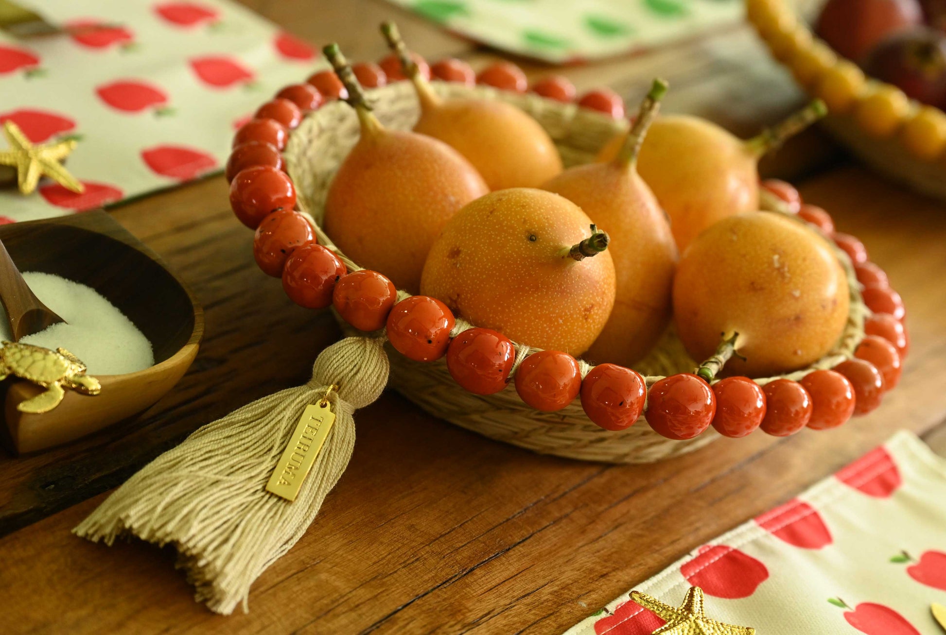 100% Palma de Iraca (fibra natural) Pompón 100% hilo poliéster, piedras en semillas naturales. |